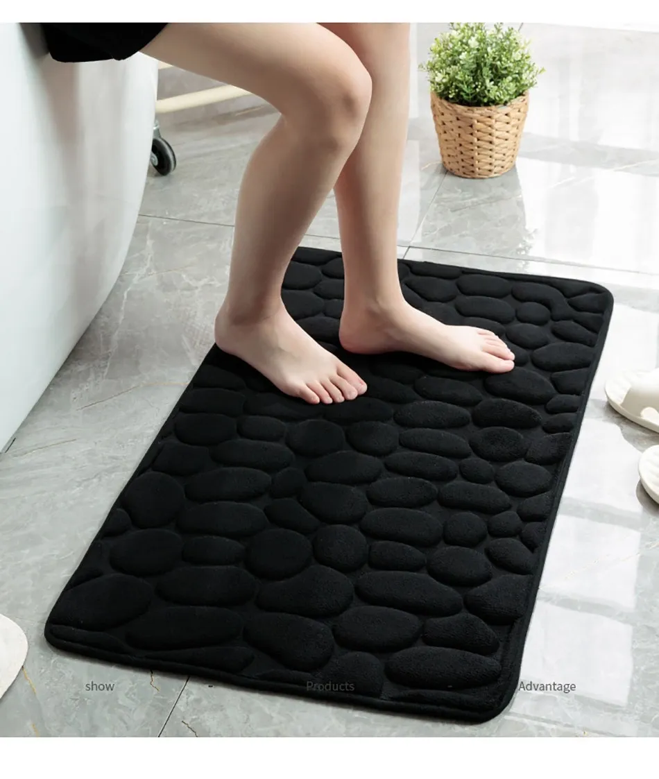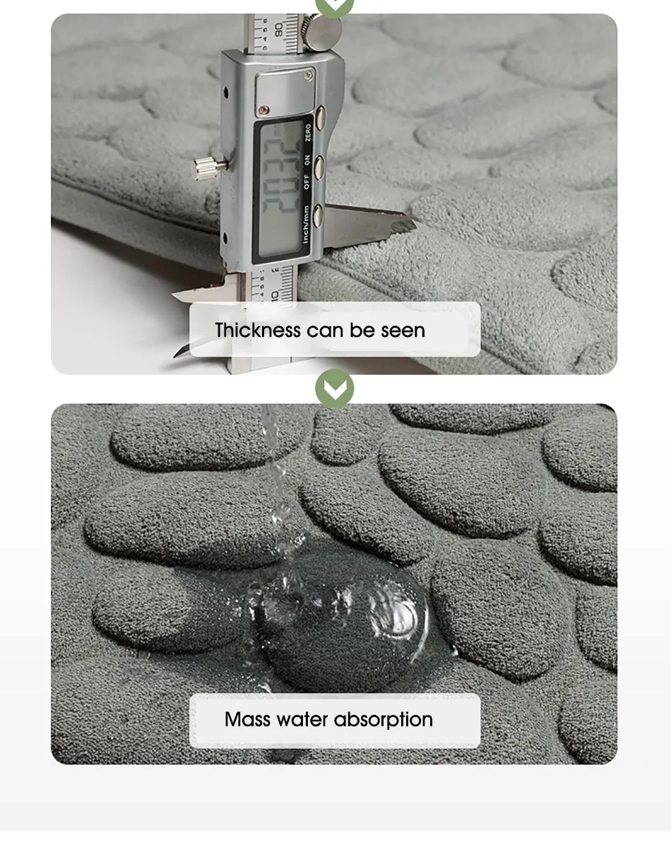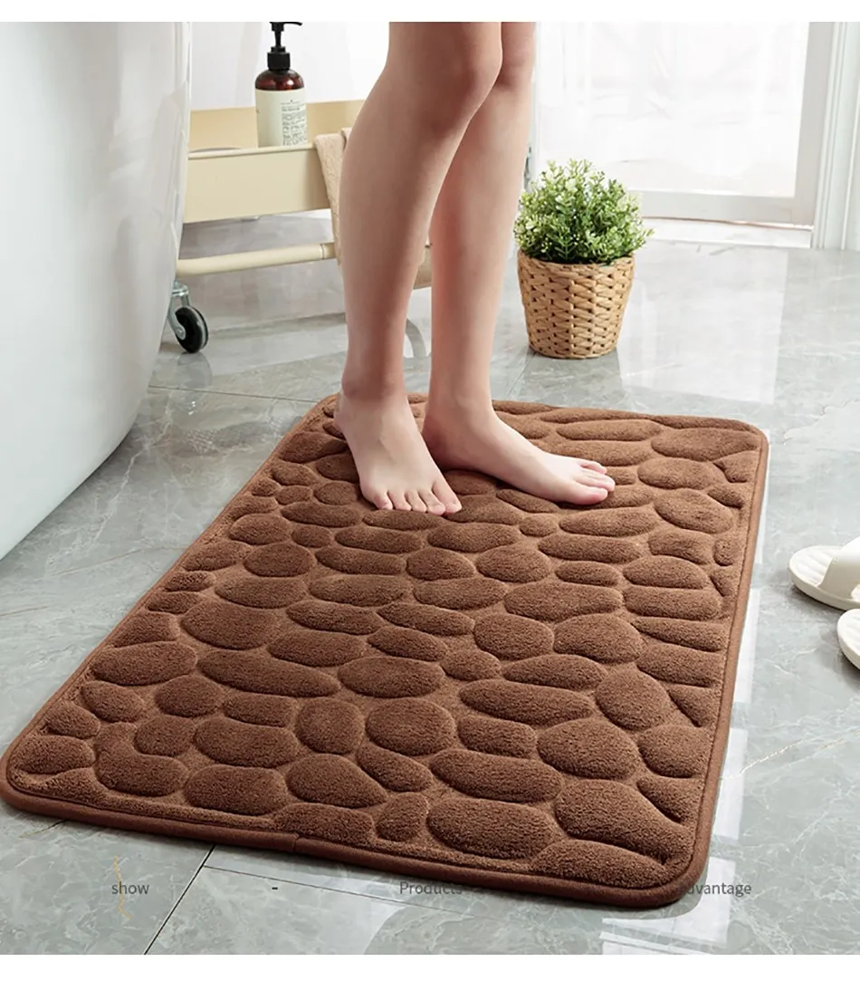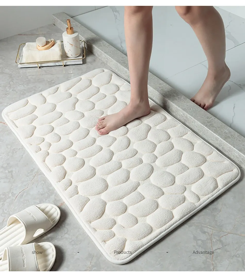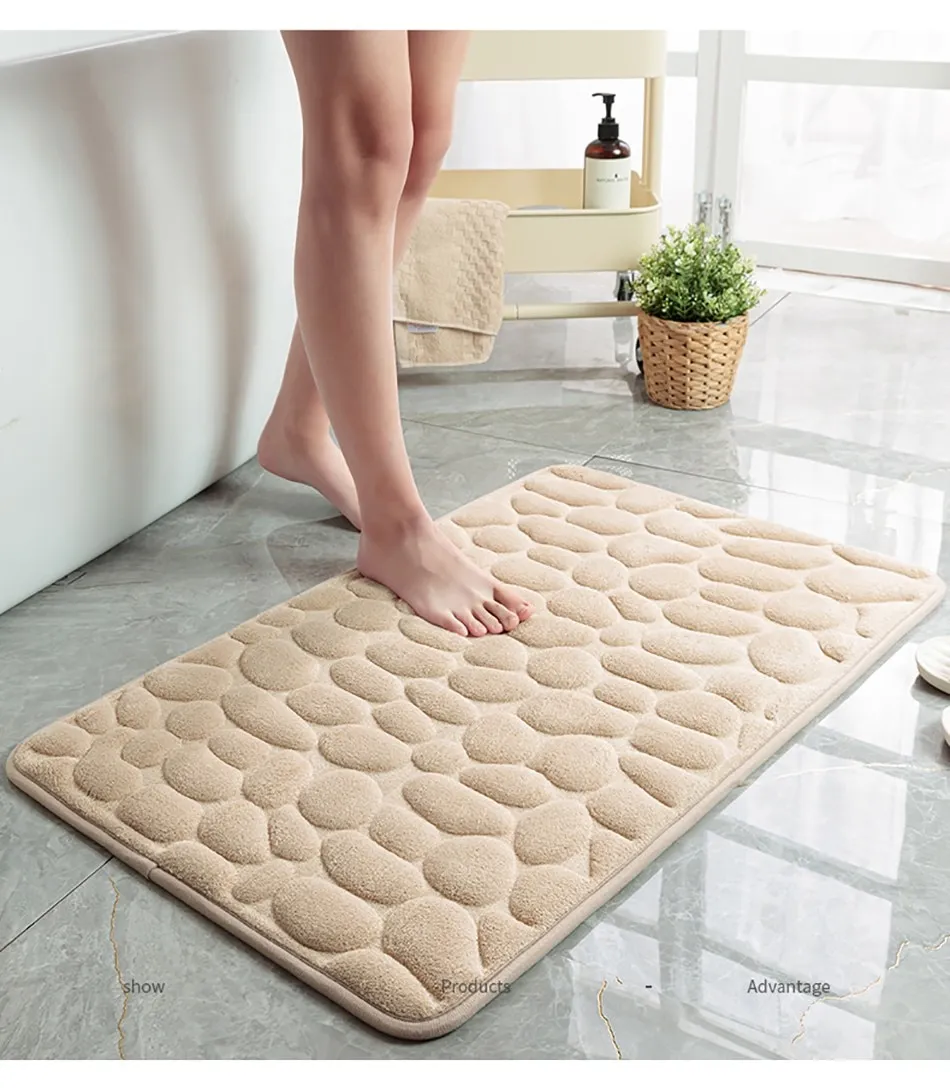 Features1. Super soft: The bath mat has thick and soft memory foam, which can provide unique comfort for your feet. The carpet is specially designed to help you eliminate the pressure on your feet and provide you with advanced support that other bathroom mats cannot provide.2. Super water absorption performance: The floor mat has a strong water absorption capacity. When you step on your feet, you can dry your feet immediately, protect your feet from the cold ground and prevent the floor from getting wet.3. Anti-slip backing: The bottom of the floor mat is made of PVC, which can be firmly fixed on the wooden floor and tile floor without damaging the floor. After each use, make sure that the bottom of the mat is dry and clean.4. Embossed cobblestone pattern,3D effect.SpecificationMaterial : coral fleece surface +memory foamSize :40*60cm/50*80cmColor:White/Black/Gray/Khaki