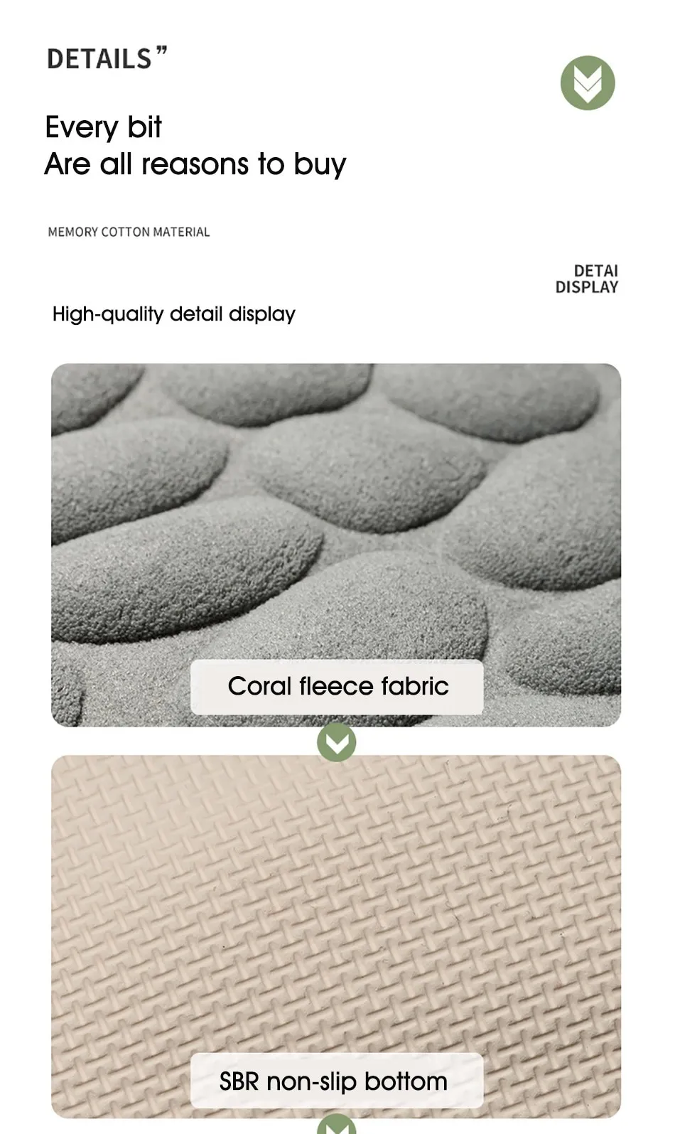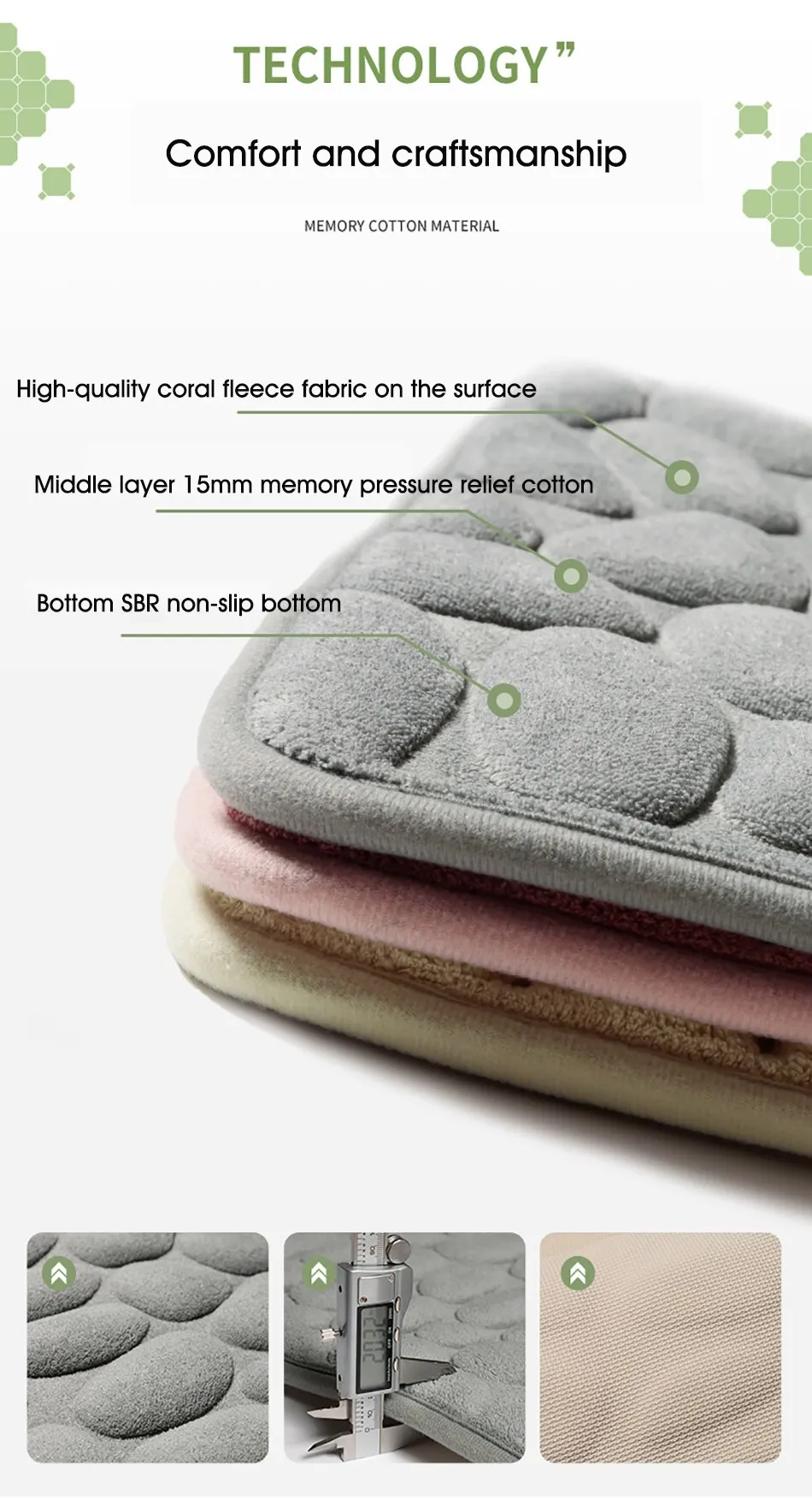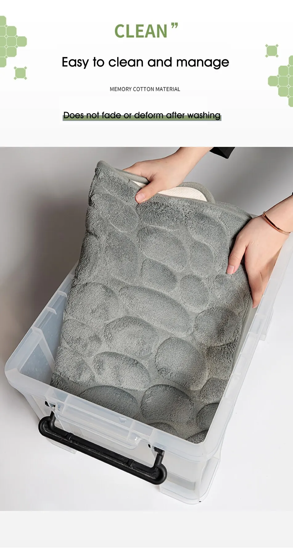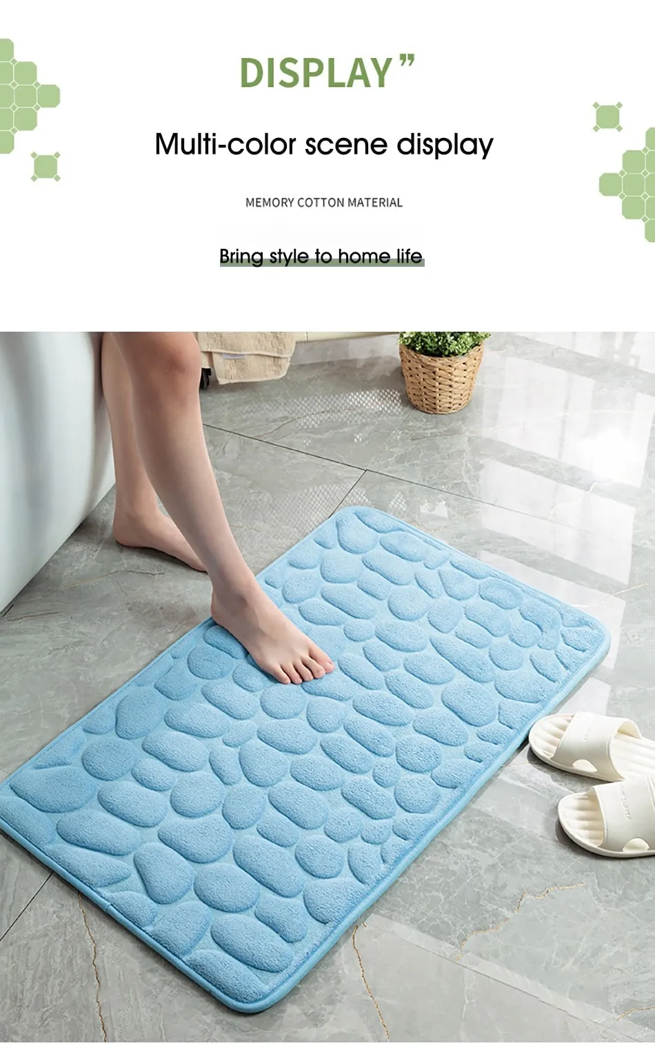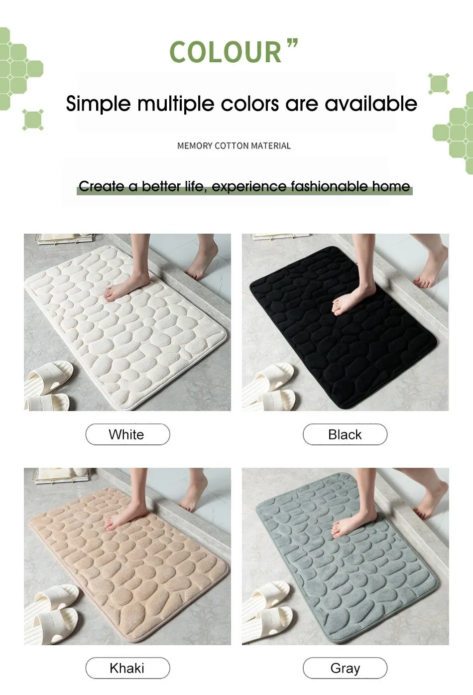 Features1. Super soft: The bath mat has thick and soft memory foam, which can provide unique comfort for your feet. The carpet is specially designed to help you eliminate the pressure on your feet and provide you with advanced support that other bathroom mats cannot provide.2. Super water absorption performance: The floor mat has a strong water absorption capacity. When you step on your feet, you can dry your feet immediately, protect your feet from the cold ground and prevent the floor from getting wet.3. Anti-slip backing: The bottom of the floor mat is made of PVC, which can be firmly fixed on the wooden floor and tile floor without damaging the floor. After each use, make sure that the bottom of the mat is dry and clean.4. Embossed cobblestone pattern,3D effect.SpecificationMaterial : coral fleece surface +memory foamSize :40*60cm/50*80cmColor:White/Black/Gray/Khaki