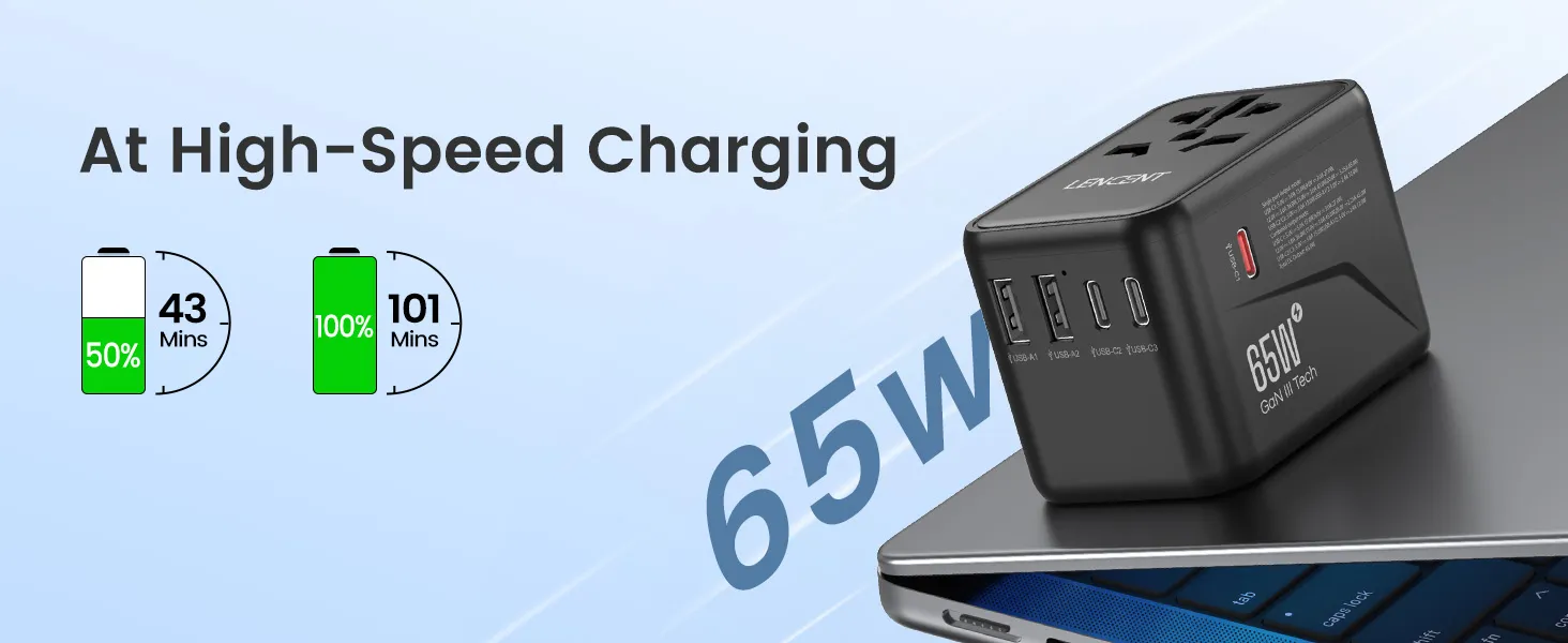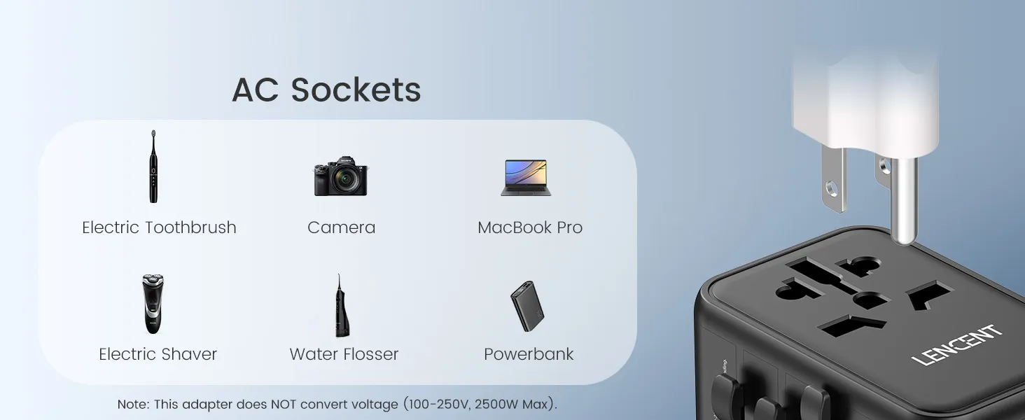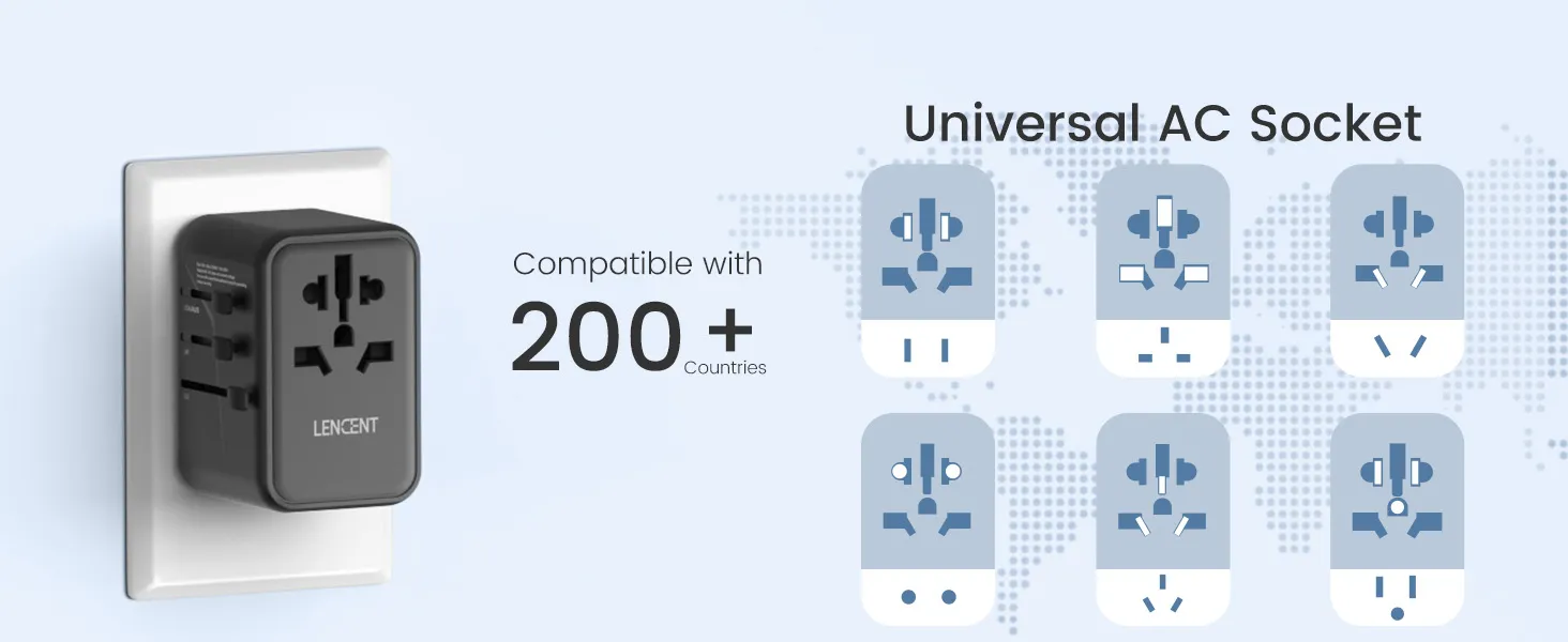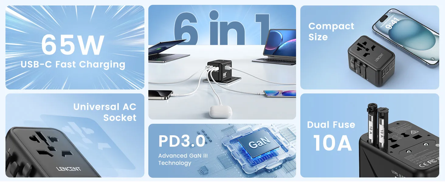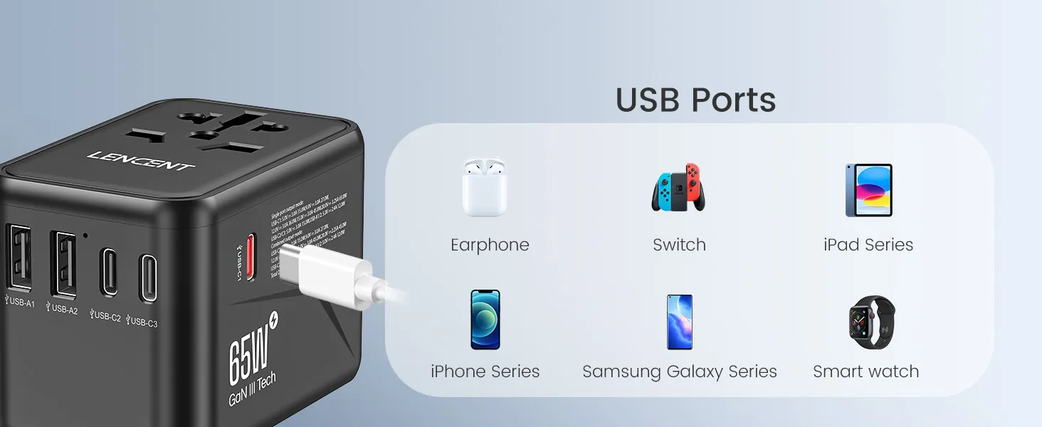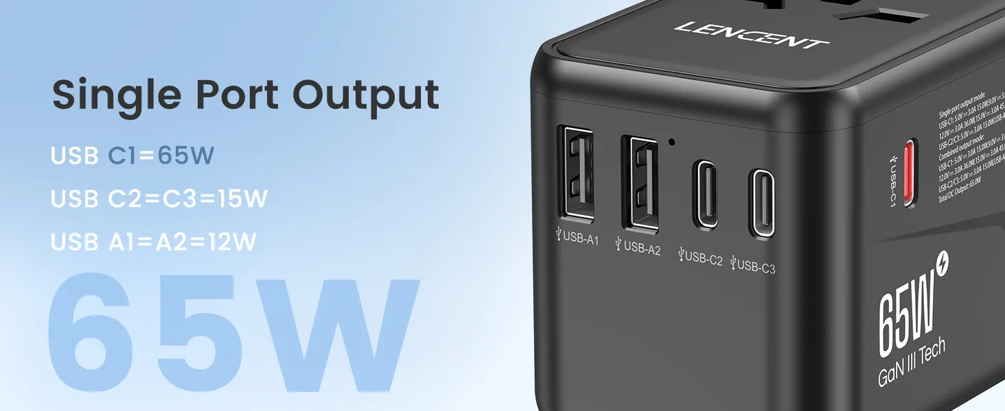 【AUTO-ID Technology for Intelligent Charging】 The LENCENT travel adapter with 2 USB ports&3 Type C ports is capable of intelligently identifying connected devices and detecting and delivering optimum charging current, ensuring fast and safe charging.