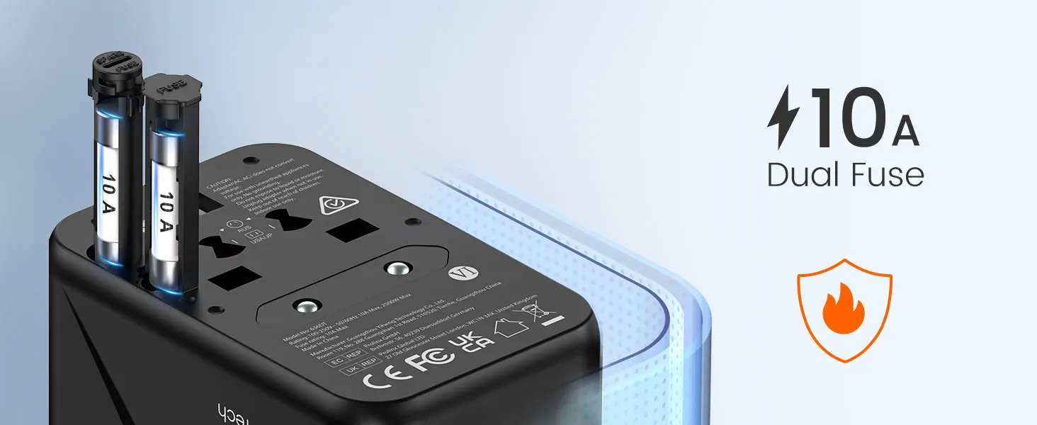 【Cutting-edge GaN III Technology】GaN Pro tech makes our latest travel adapter smaller without a drop of power, and provides better low-temperature fast charging experience. Equipped with integrated double 10A fuse for overload protection and safety valve, it will protect people from injury if they directly touch live parts on the socket.