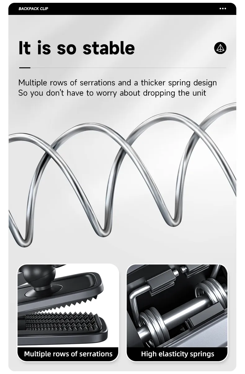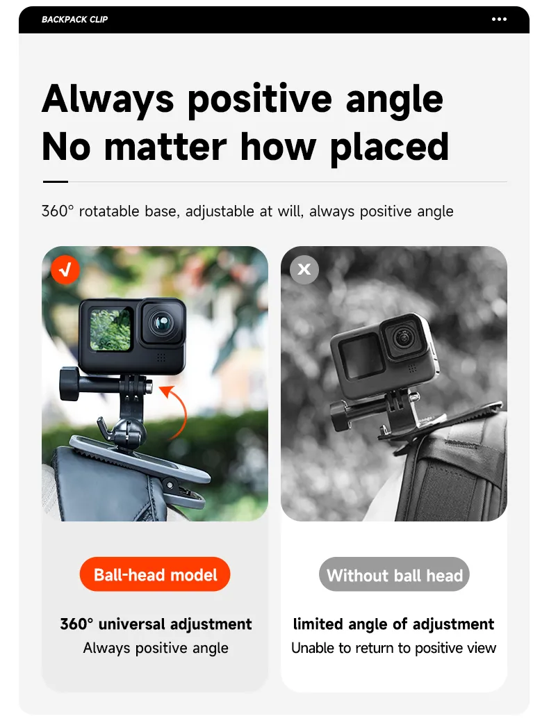 360° Universal adjustmen Always positive angle.Normal backpack clips limit the angle. The backpack clip has to be adjusted to switch the angle, which is more troublesome.