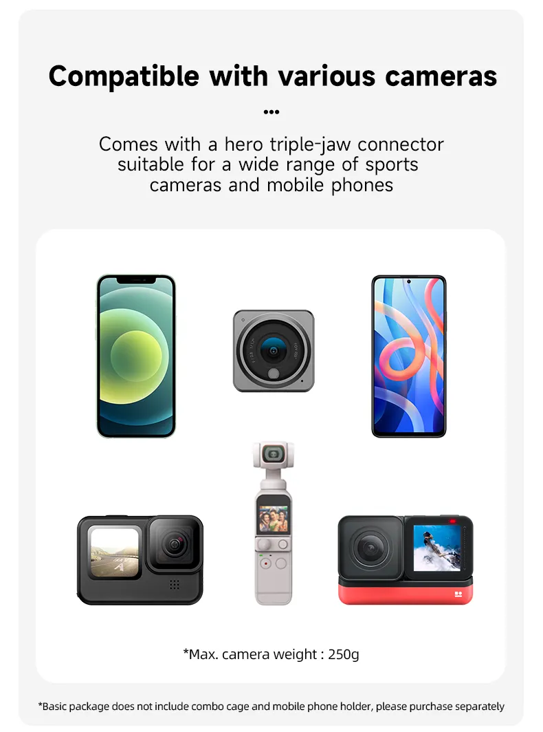Designed for compatibility with popular models like GoPro and Insta360, it offers versatile mounting options for capturing dynamic shots.