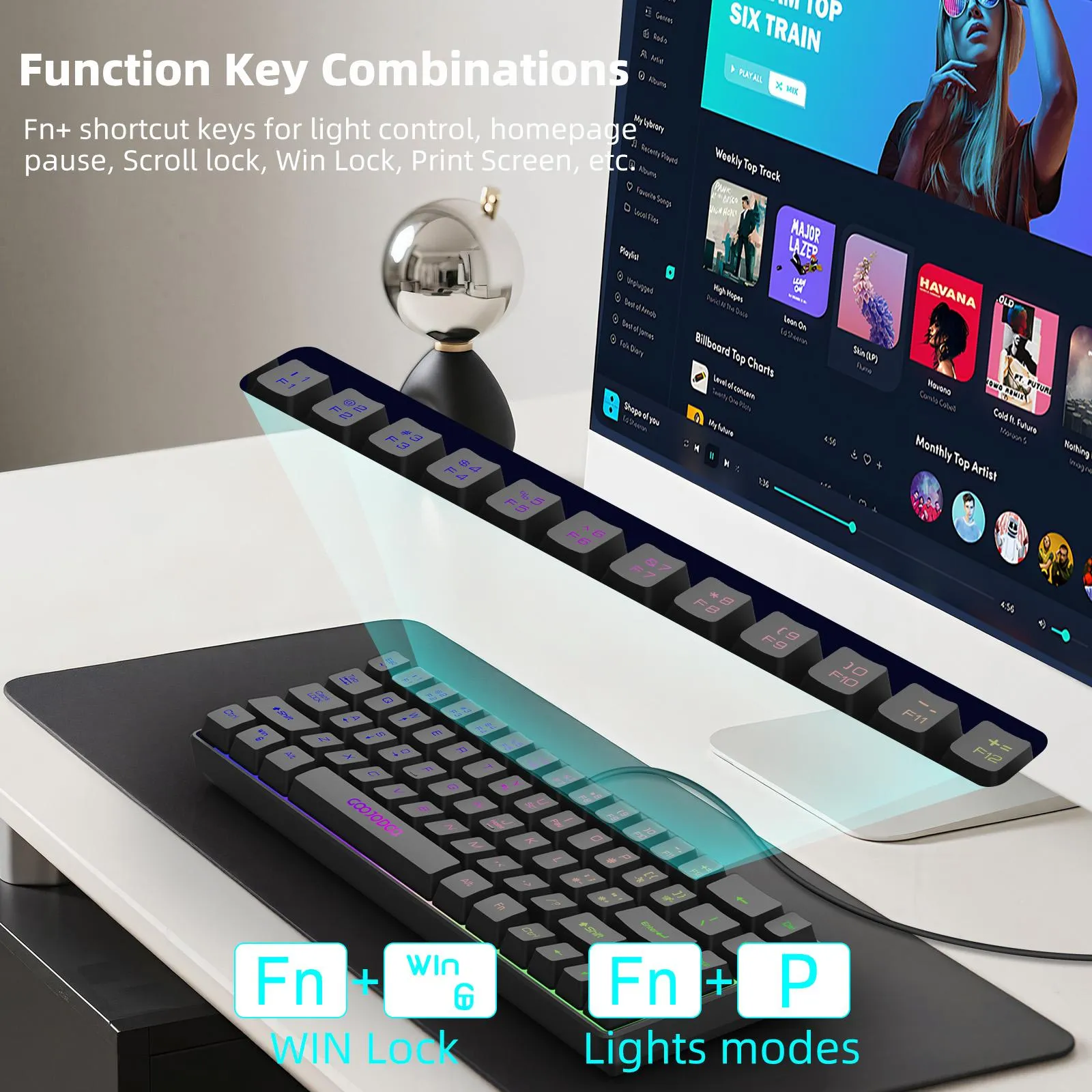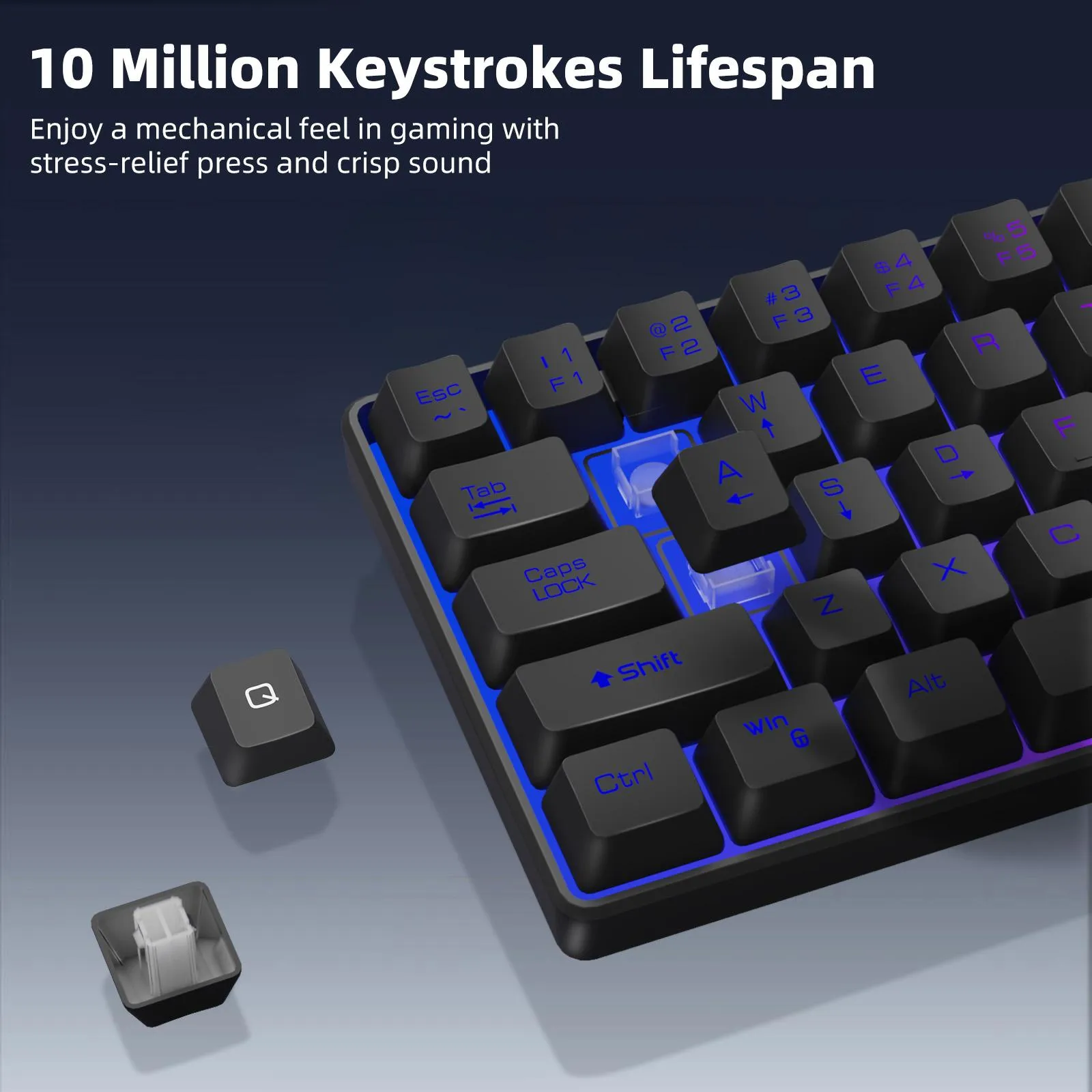 RGB Backlighting with Custom Controls: Type and play effortlessly in the dark. The gaming keyboard with transparent characters lets the 7-color backlight shine through clearly. Choose from always-on, breathing, or off lighting modes using FN+P, adjust brightness with FN + * / - keys, and control the breathing speed with FN + ] / [.