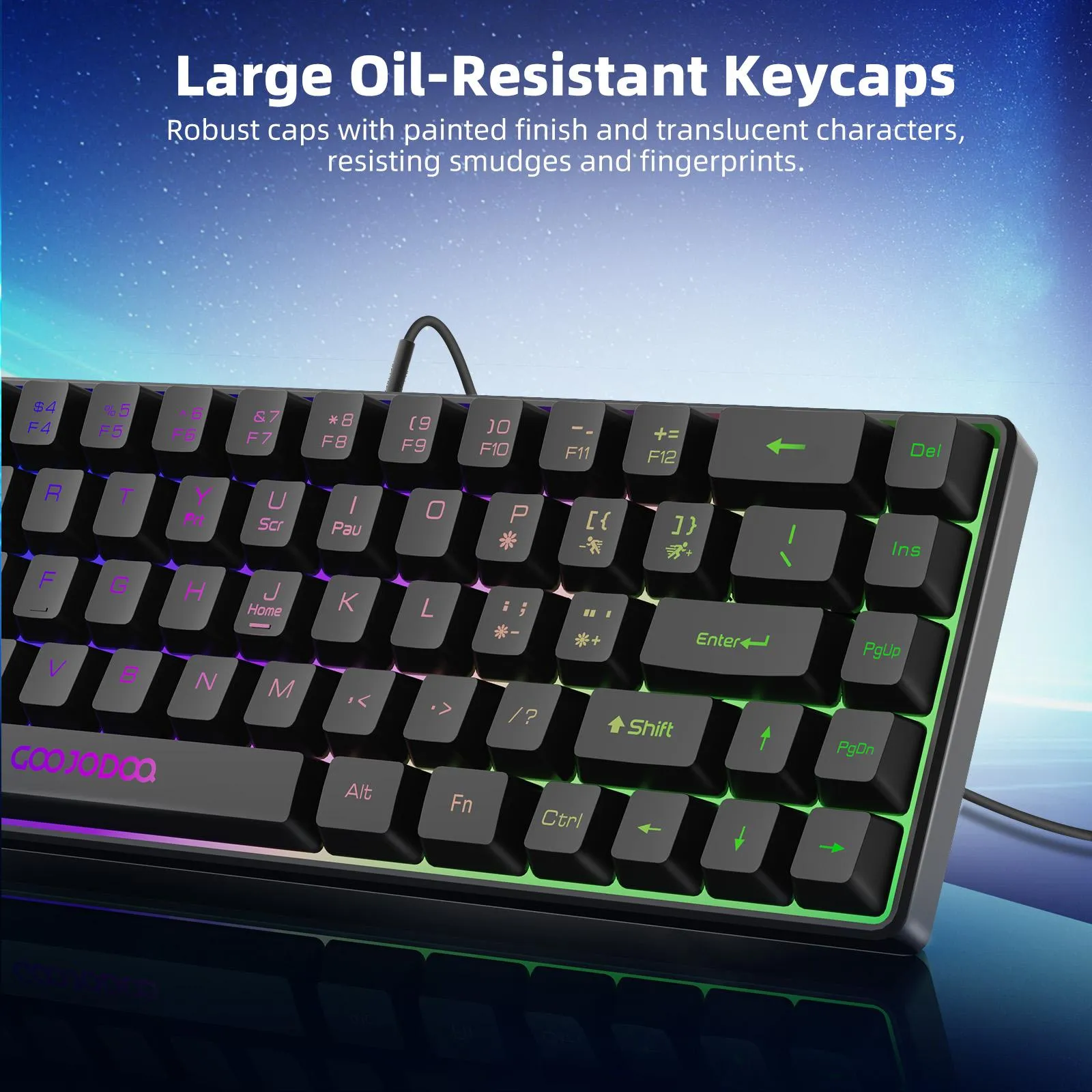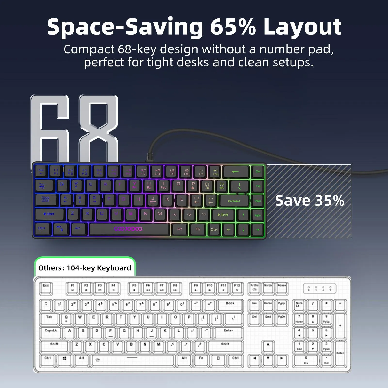 Reka Letak 68 kekunci padat: Reka letak 68 kekunci mengimbangi kefungsian dan saiz dengan sempurna. Dengan menolak kawasan papan kekunci angka, papan kekunci mini ini menjimatkan 35% ruang desktop yang berharga berbanding dengan papan kekunci 108 kekunci sambil masih menyimpan semua kekunci penting untuk permainan dan tugasan harian. Empat pad getah tidak licin memastikan papan kekunci tetap di tempatnya.