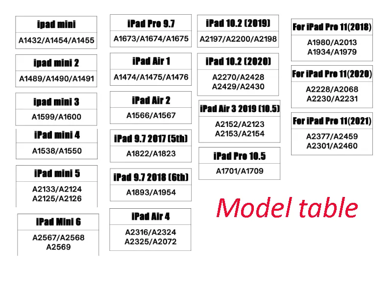 Suitable follow model: iPad Pro 12.9 Inch(18-21) iPad Pro 11 Inch(18/20/21) iPad Pro 12.9 Inch(15-17) iPad 9th 10.2 Inch iPad 7th 8th 2020 10.2 Inch iPad Air4 10.9 Inch 2020 iPad Air3/Pro 10.5Inch iPad 9.7 Inch iPad 2017/2018 iPad 5/6/Air/Air2 iPad 2/3/4 iPad Mini 6 iPad Mini 4/5 iPad Mini 1/2/3