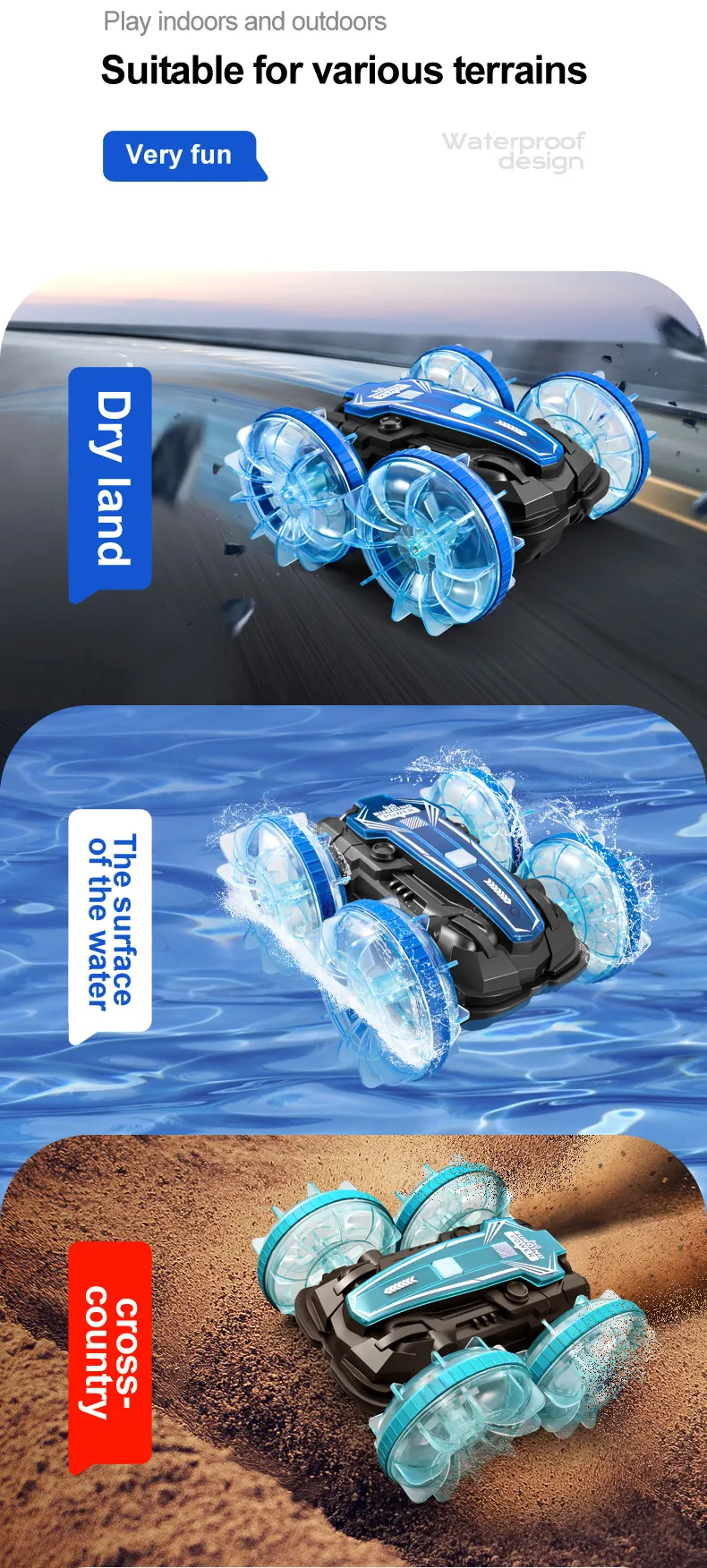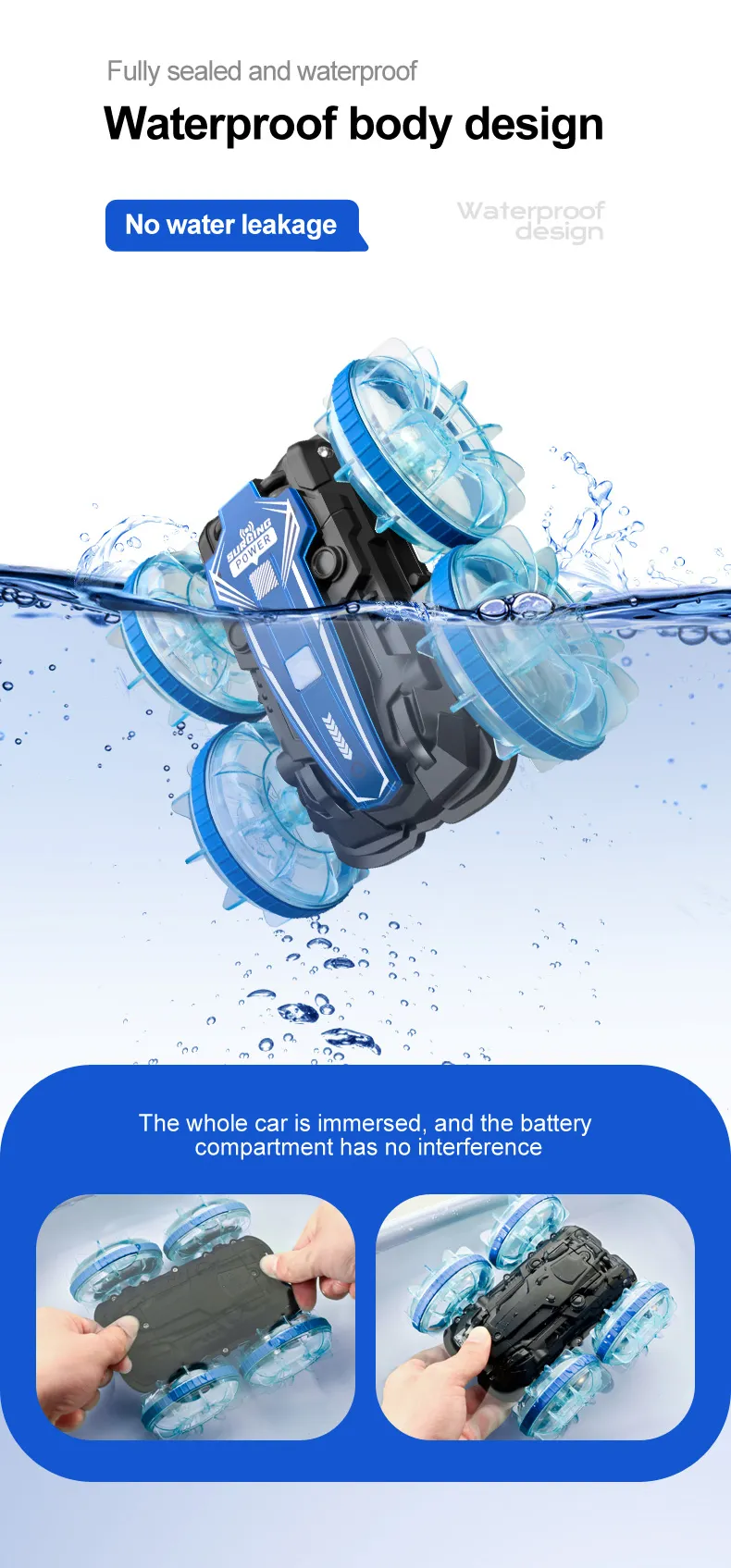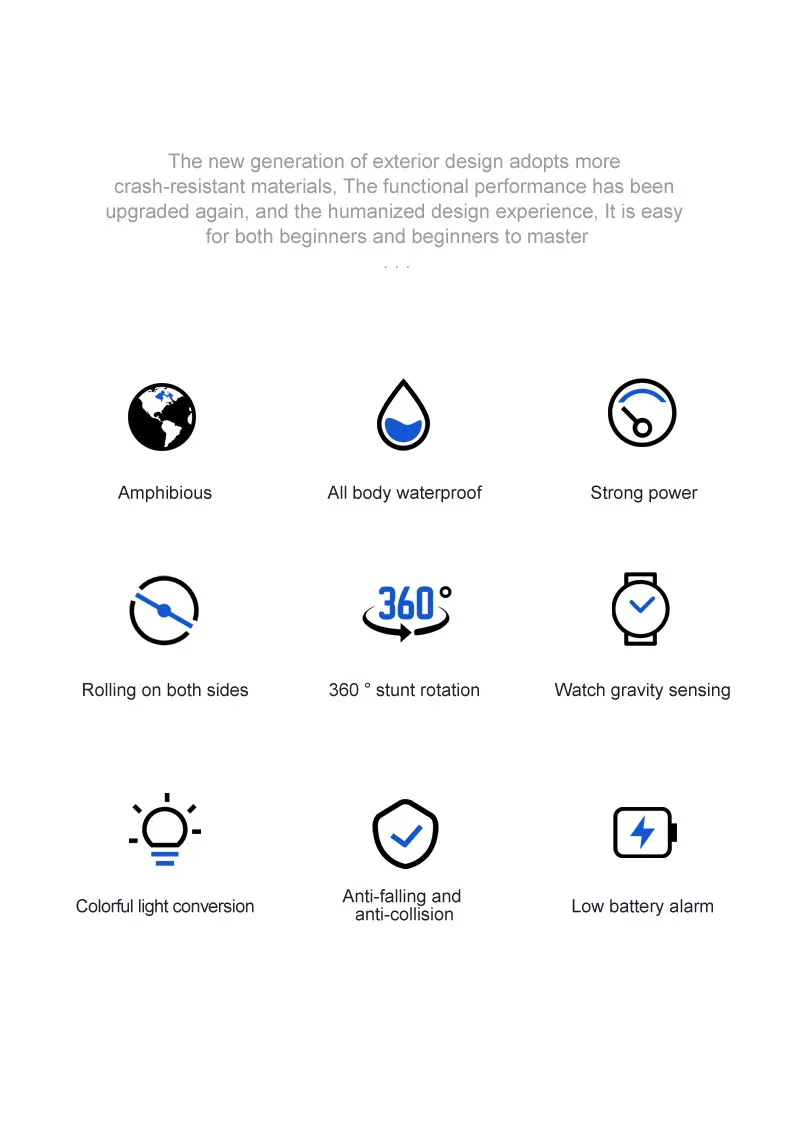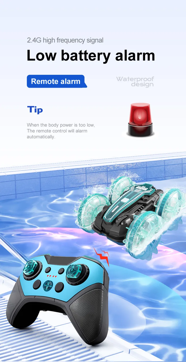 Functions: Forward/Backward,Turn Left/Right, Double-sided Driving, 360° Rotation, Water and Land