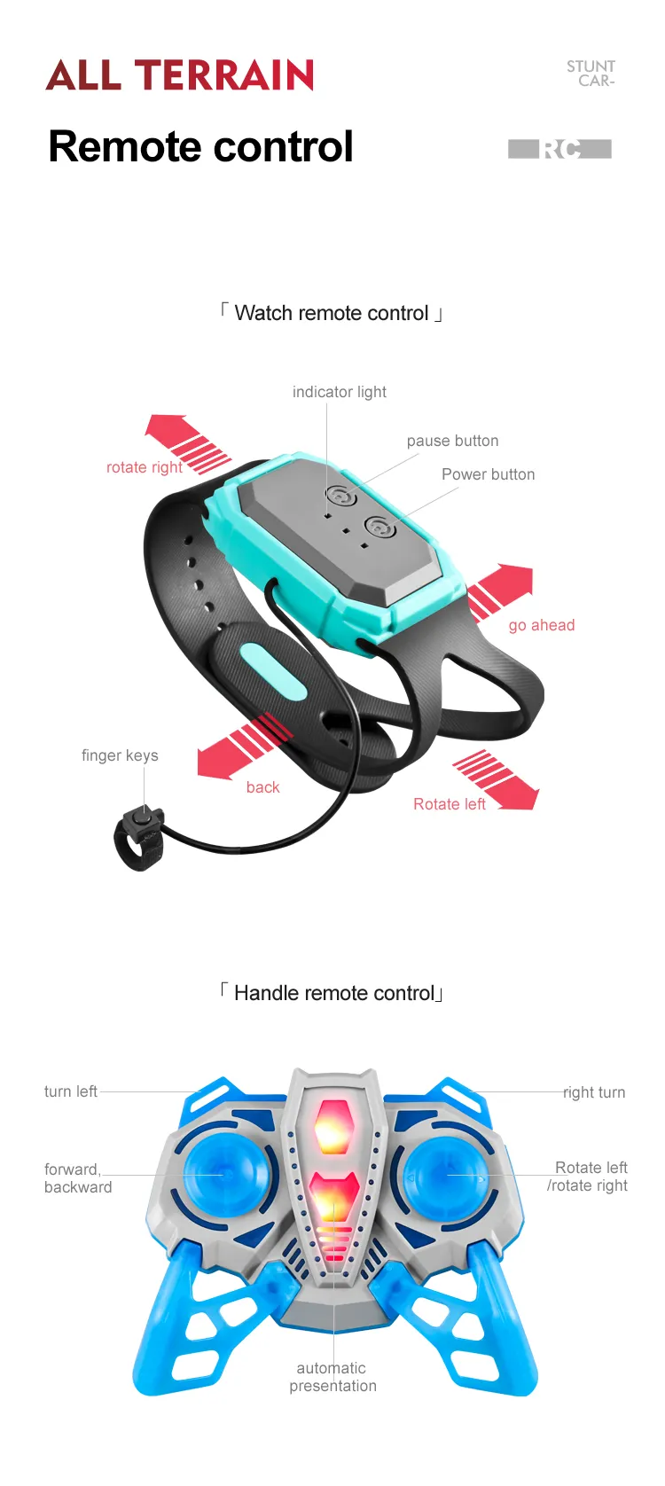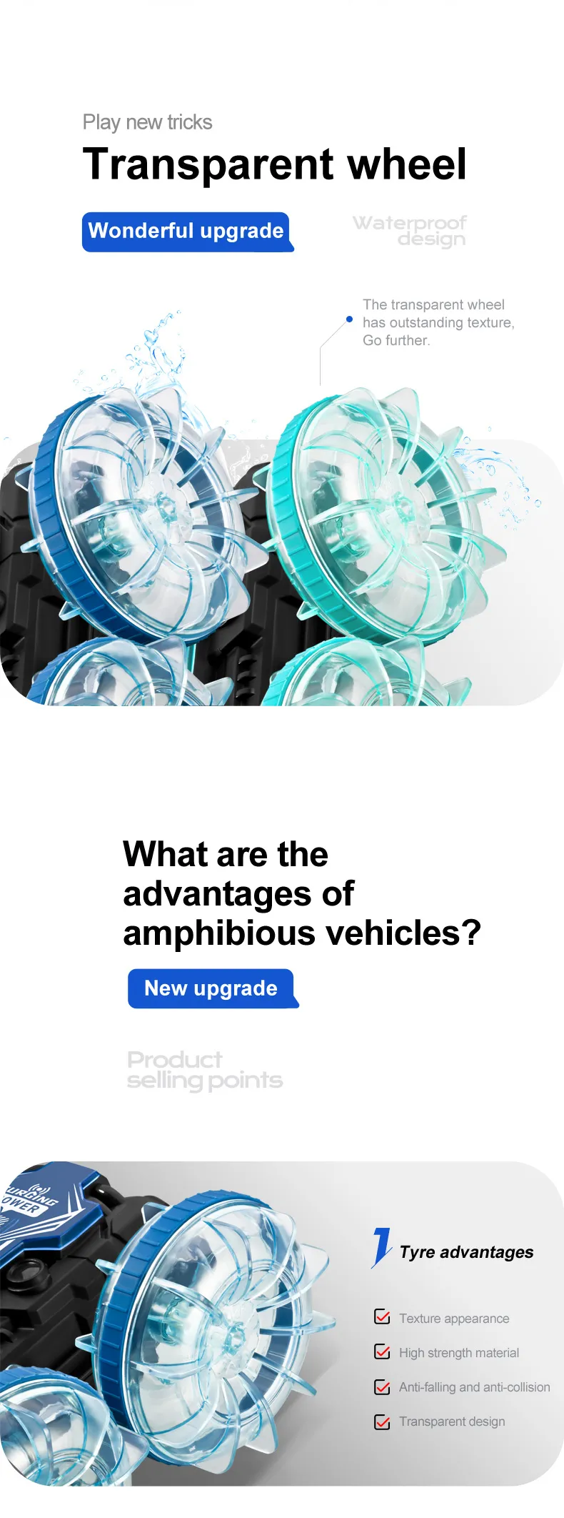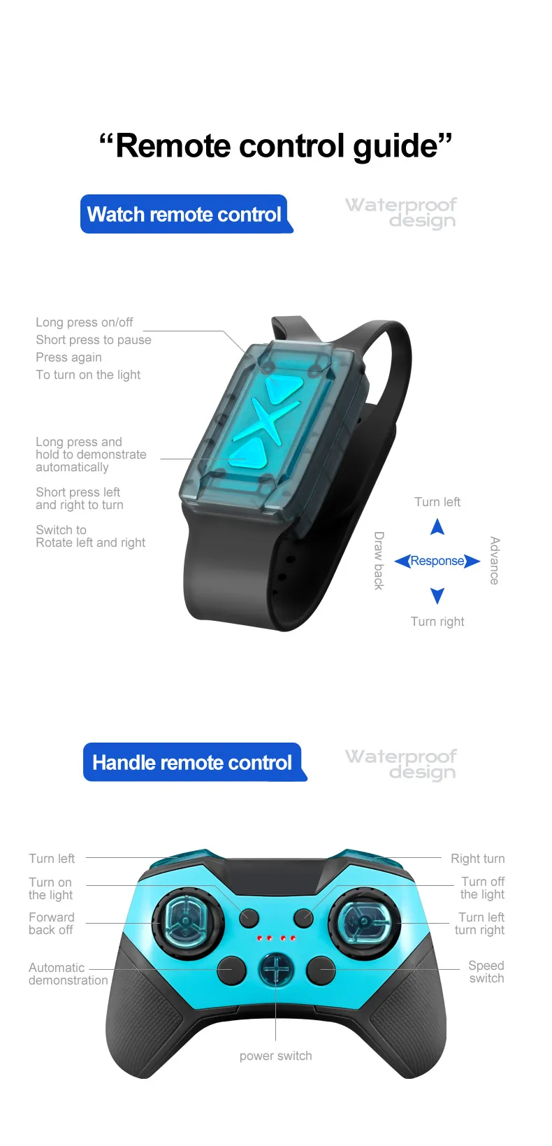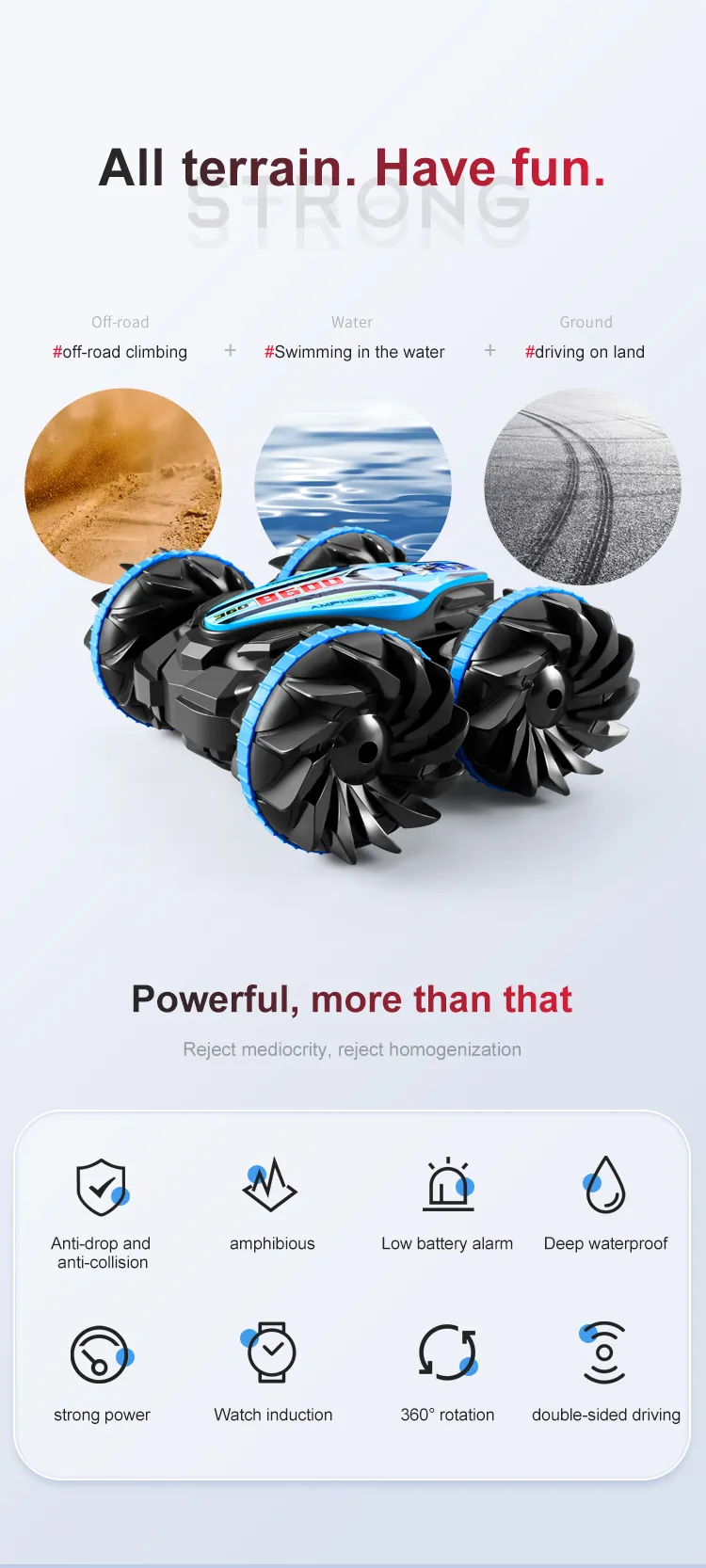 Functions: Forward/Backward,Turn Left/Right, Double-sided Driving, 360° Rotation, Water and Land
