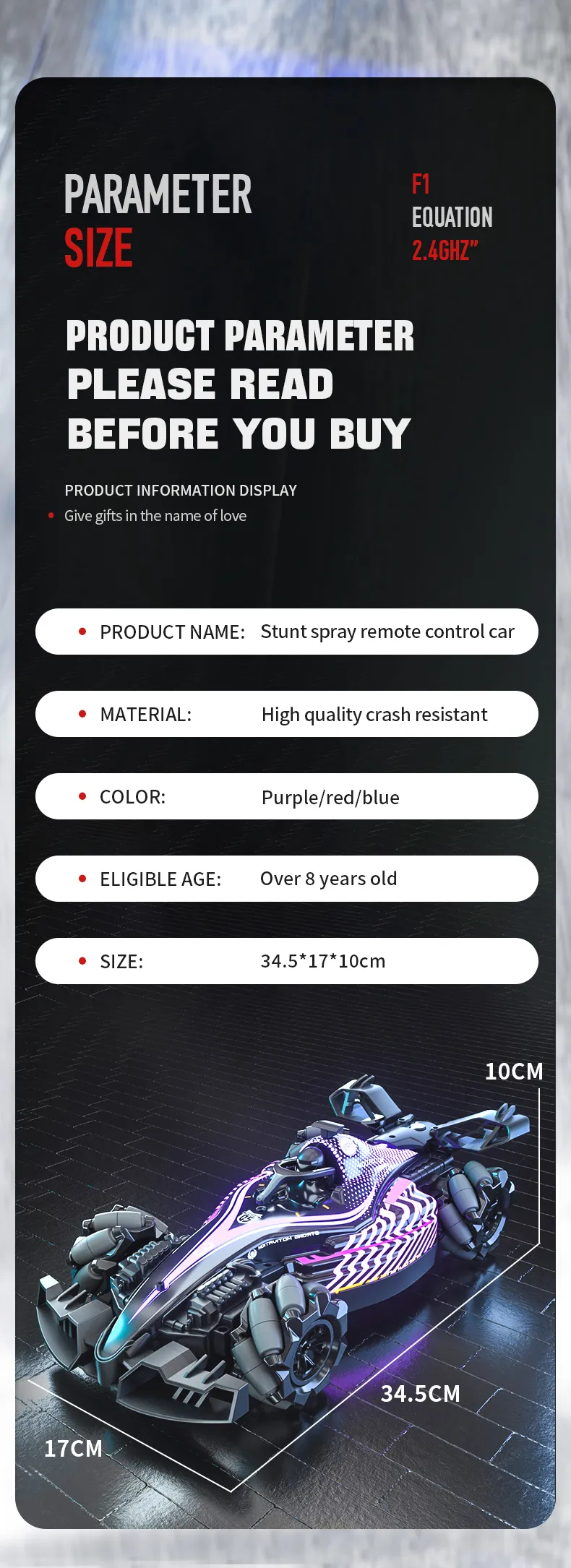 Konfigurasi produk: Kereta aksi*1, alat kawalan jauh*1, bateri*1, kabel pengecasan*1, pemutar skru*1, manual Cina dan Inggeris*1