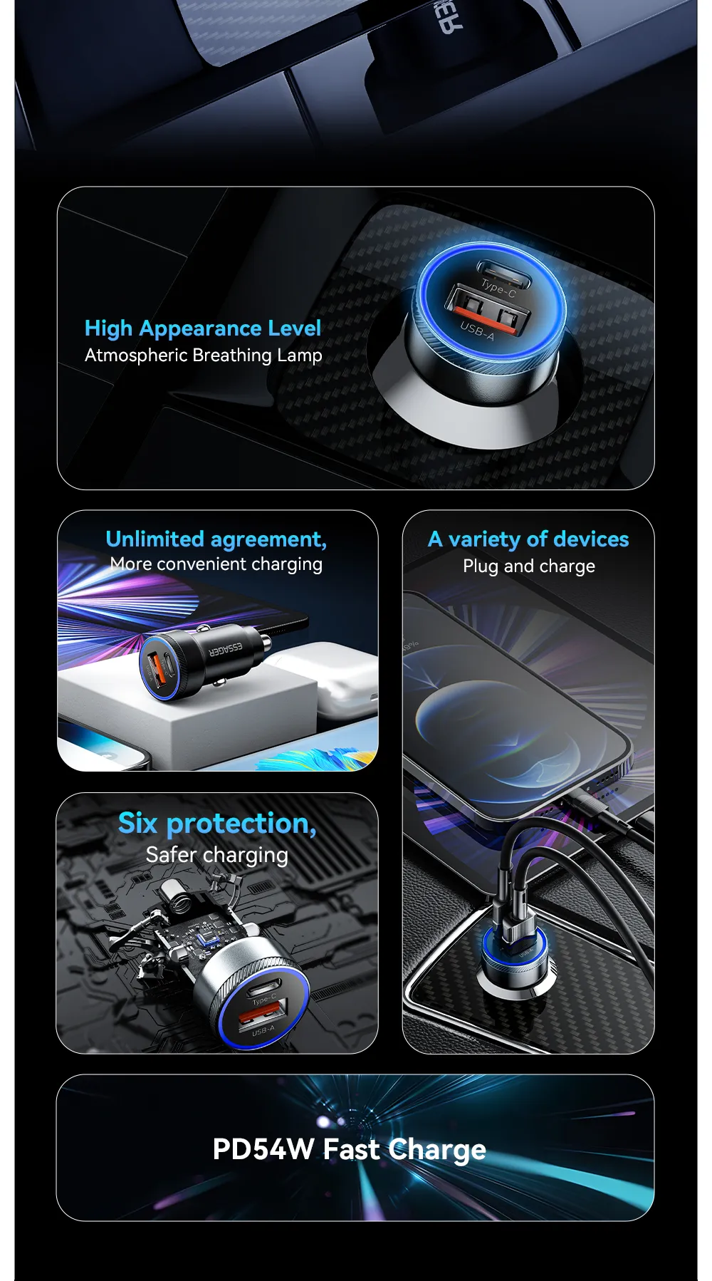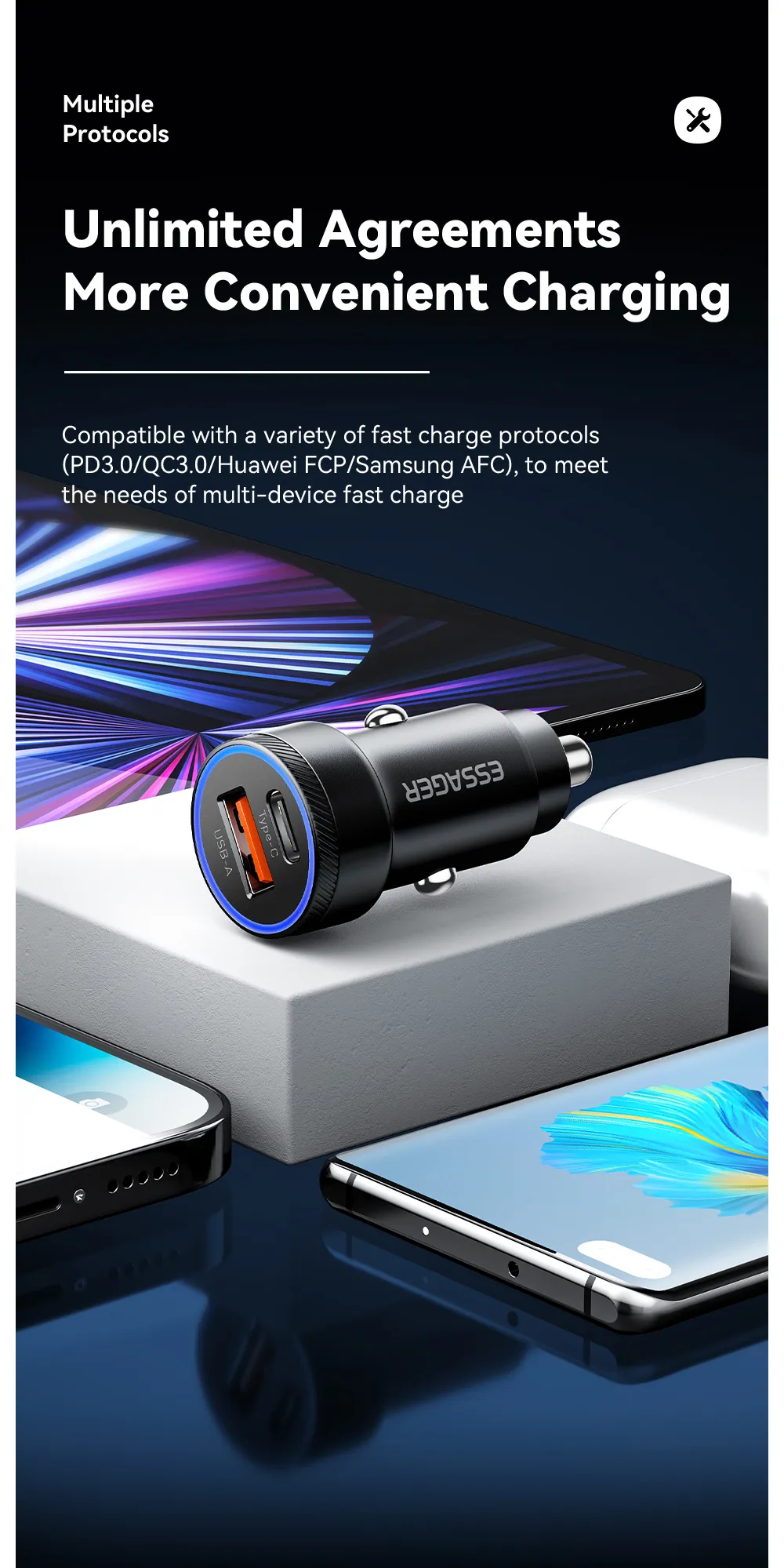 3.PD36W fast charge, with PD fast charge line, 30 minutes full 50%; Type-C single-port output up to 36W(MAX), USB QC3.0 single-port output up to 18W(MAX) (The above data from Essager laboratory, due to the change of environmental factors there may be some errors)