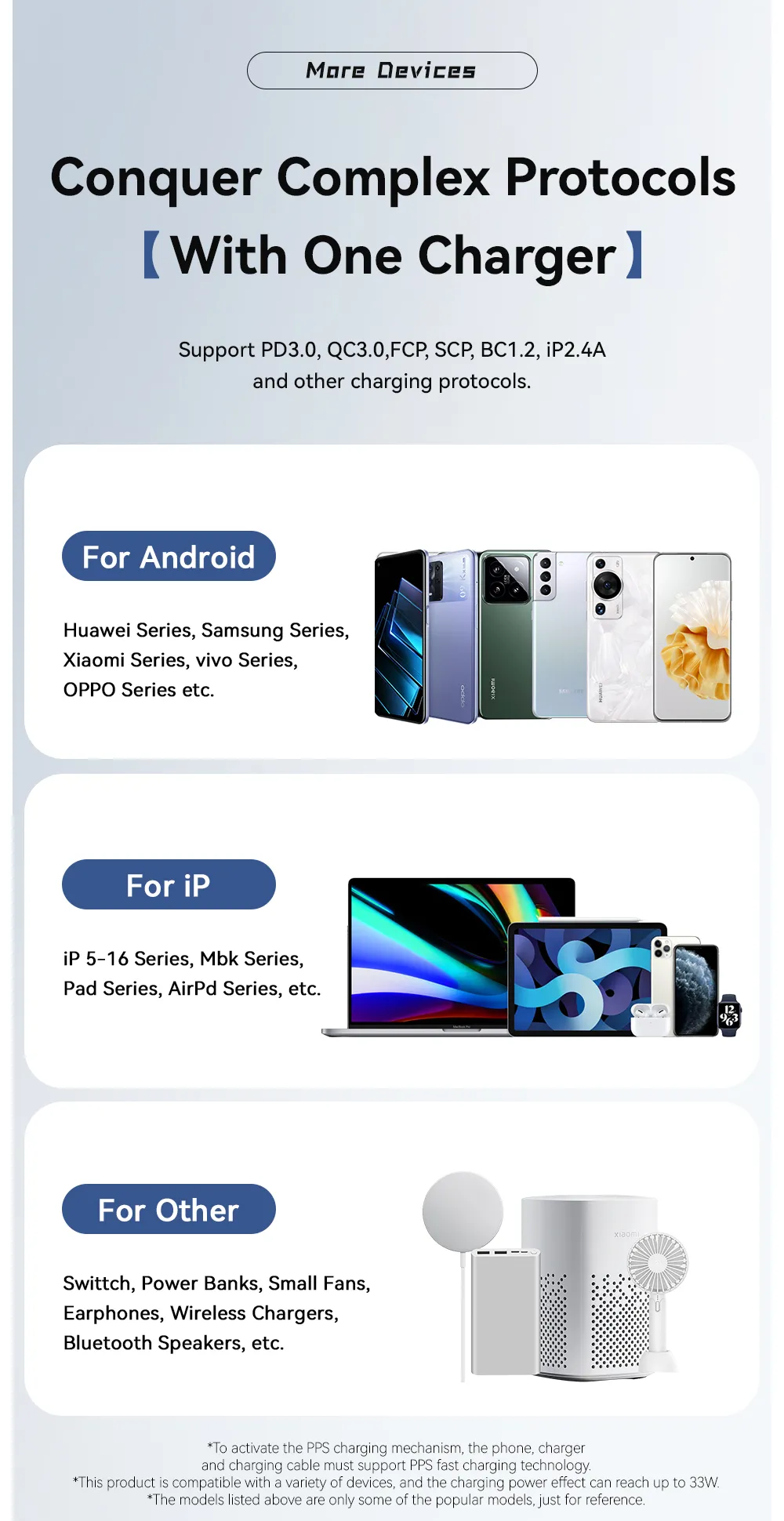 3: Supported protocols: PD, QC3.0, QC2.0FCP, SCP, BC1.2DCP, Apple2.4A, Samsung 2A, Samsung AFC and many other fast charging protocols, meeting the charging needs of most devices on the market
