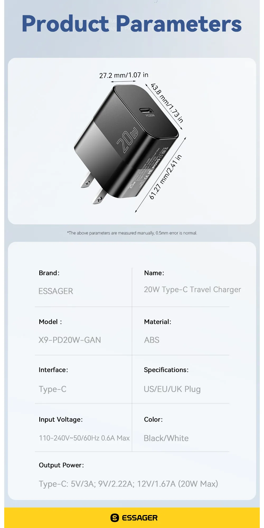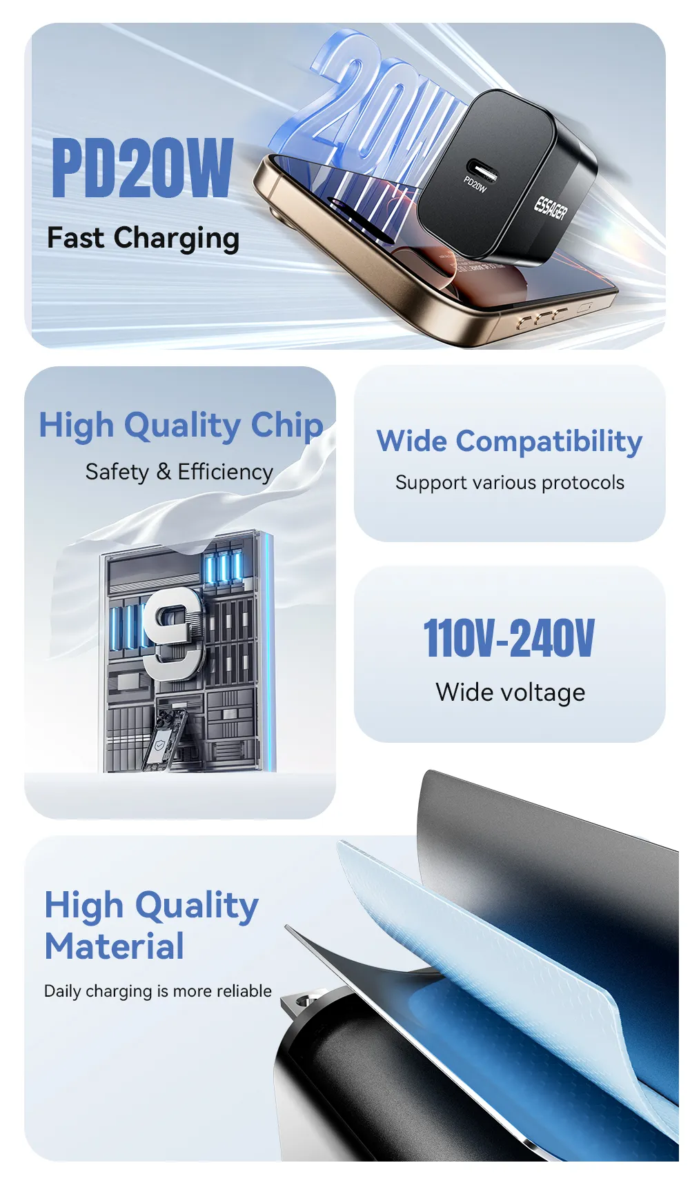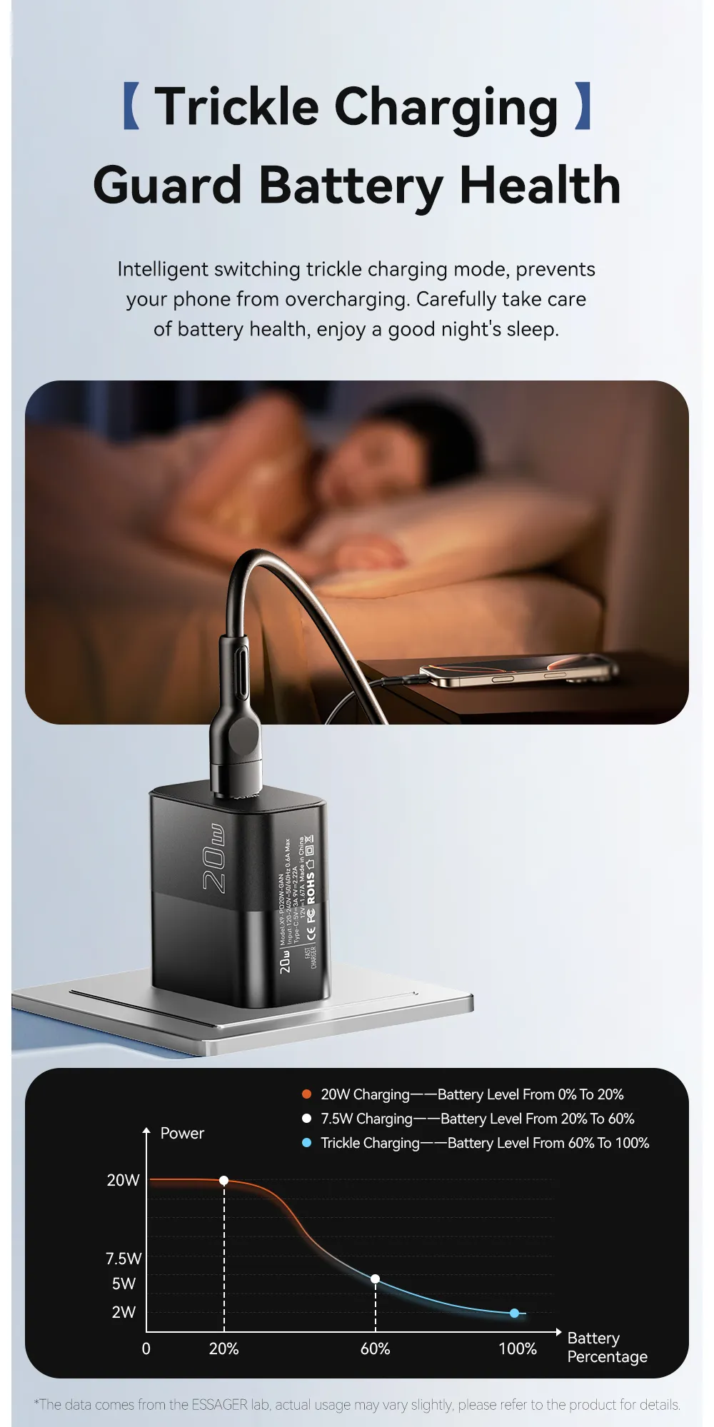 1:20W charger (Intelligent low-temperature fast charging, intelligent recognition chip, charging protection, compatible with multiple devices)