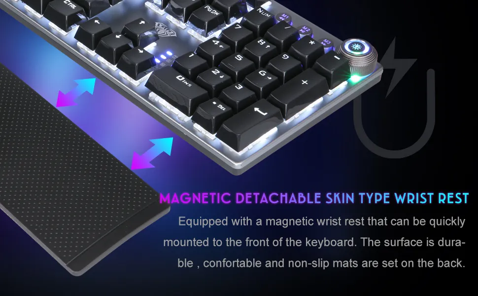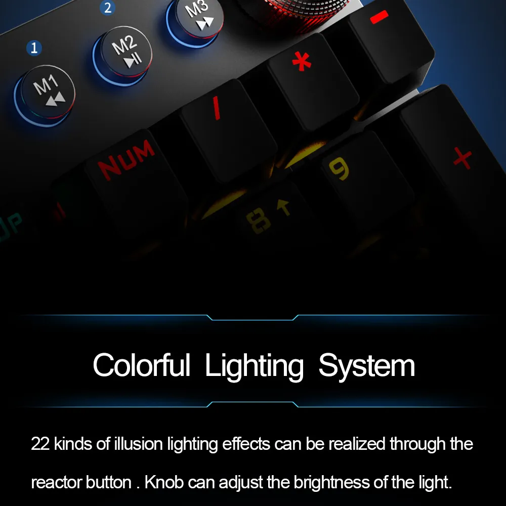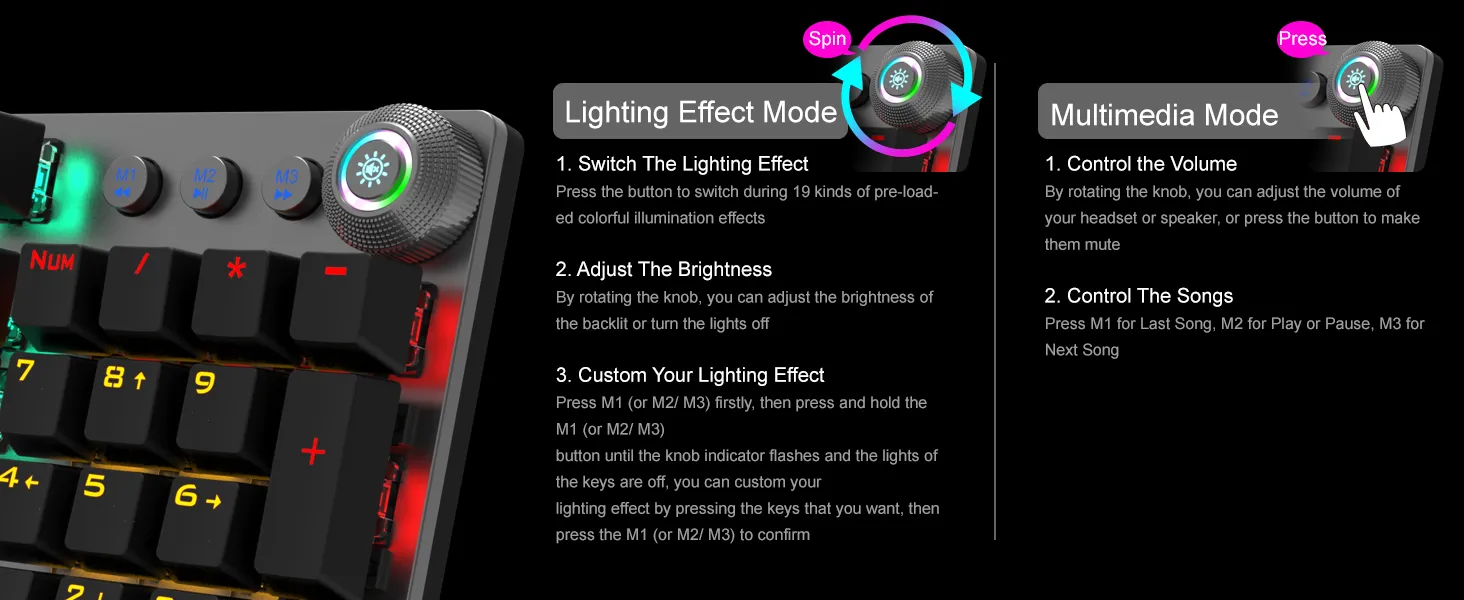 Knob: Rotate the knob to switch between 22 backlight effects and brightness