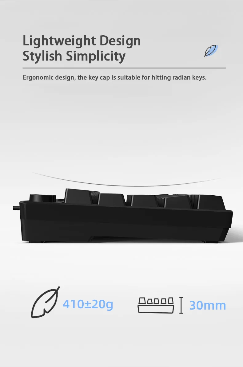 The key cap is suitable for hitting radian keys, and each row has a corresponding concave and convex height curve to fit.